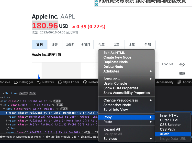 股票應用 -- XPath in firefox -- google import xml -- firefox 找 XPath step 1 -- Xpath step 2 -- 我的 XPath 文字 -- importXML Data Freshness (1 hr)