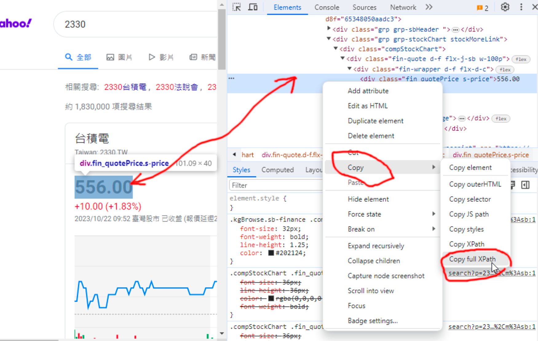chrome -- tw yahoo stock -- chrome inspect -- copy xpath