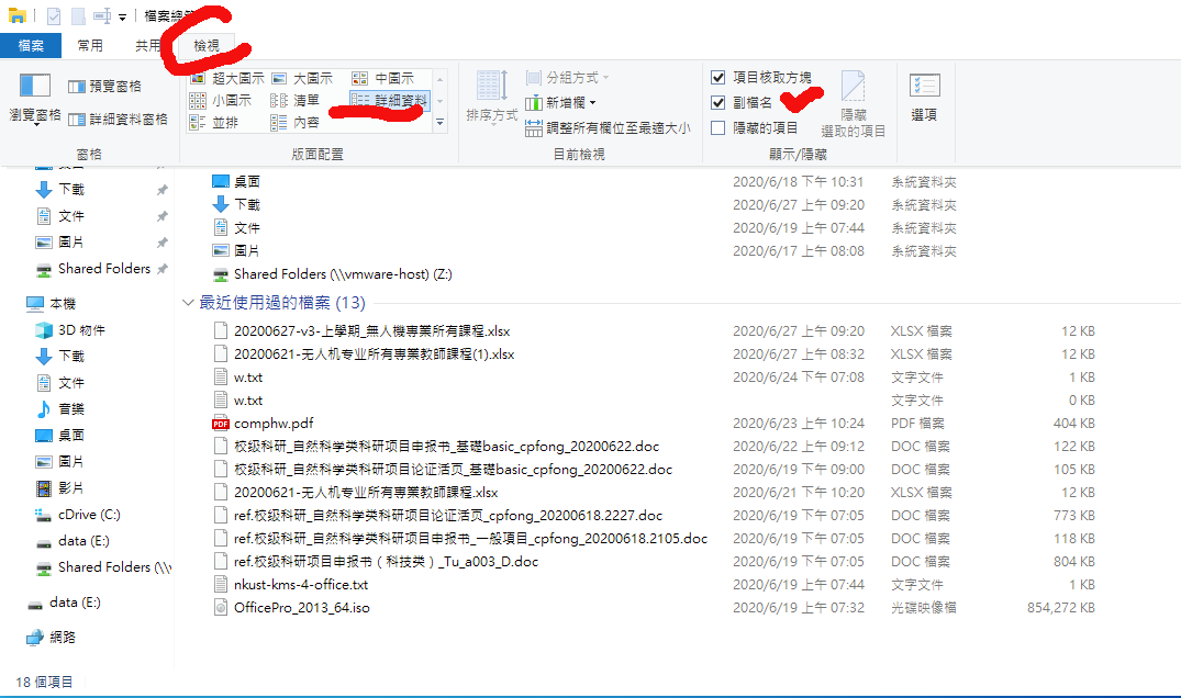 -- 文件管理 1. explorer(檔案總管)的叫出方法: W+e MouseR/last_5 檔案總管 -- 檔案總管檢視把副檔名及隠藏檔顯現