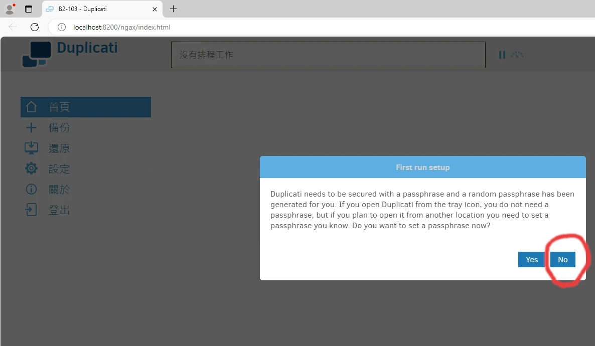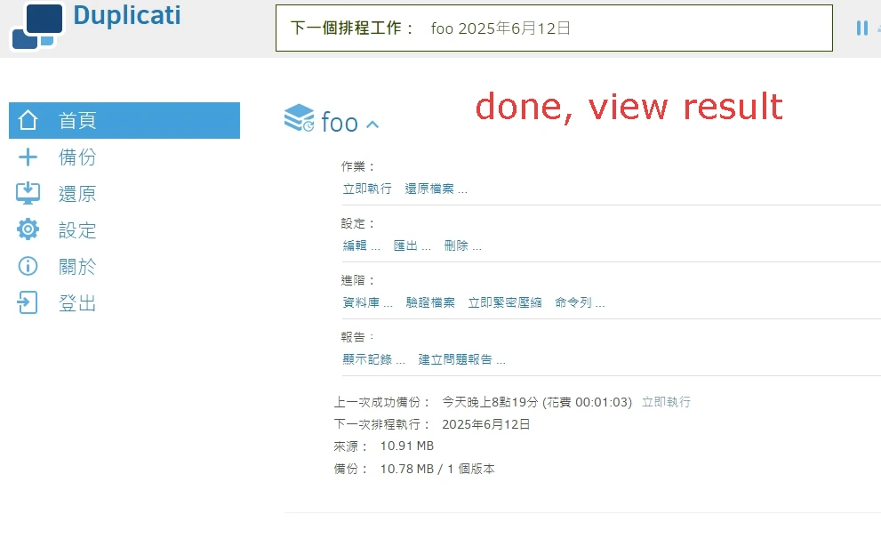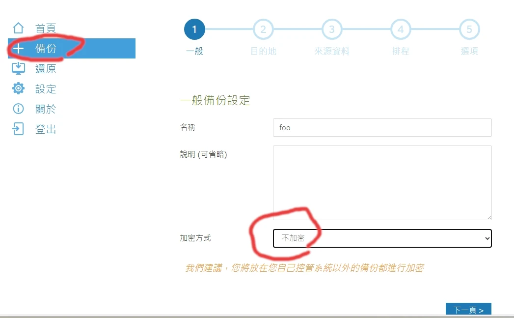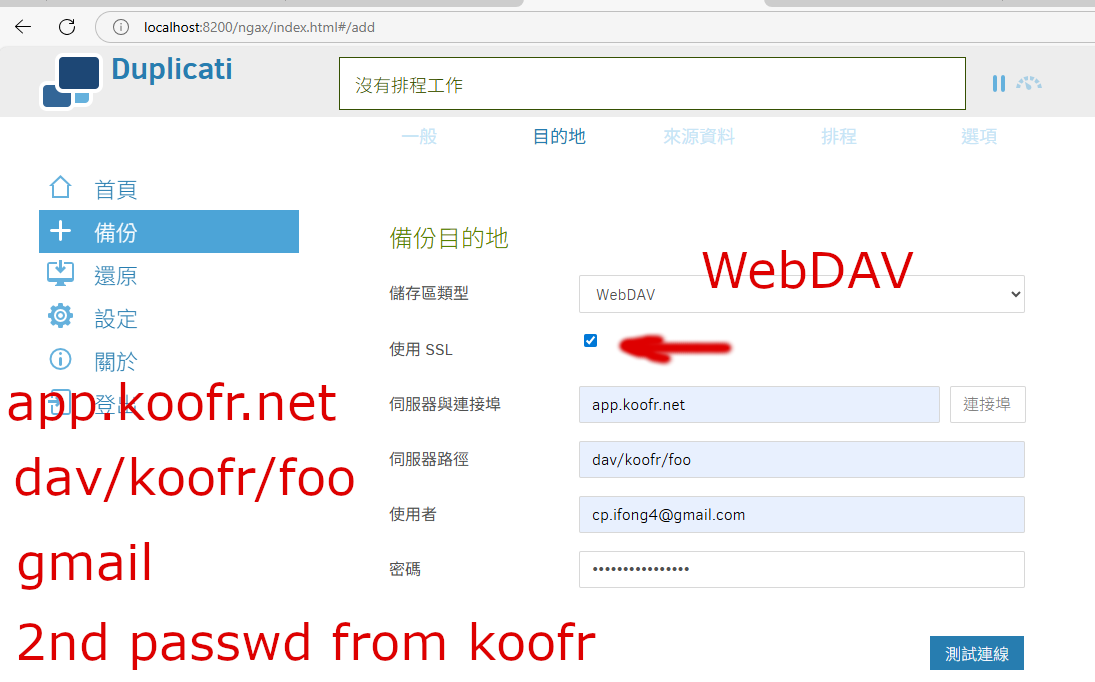 more on duplicati -- 先不加密 -- 由空白開始 -- 先不加密 -- 這個設定最重要,弄好要測一下 -- 完成後看結果