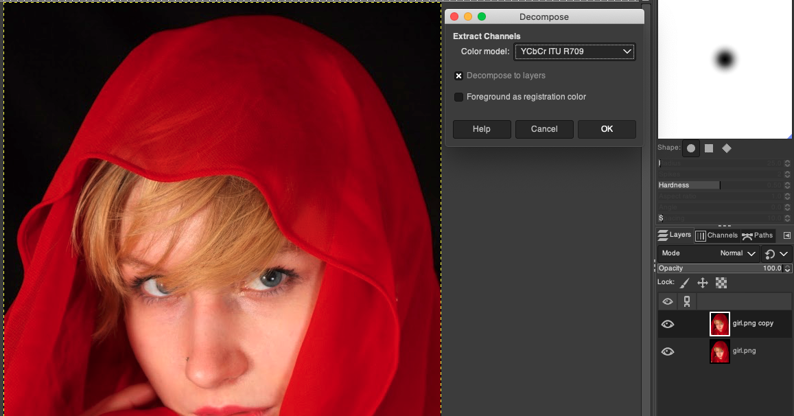 | Place the RGB - Red channel over the Luma - y709f | 重合二張 B&W 相片可借由 mask, 但在不同 layer 要複製貼上時要先 anchor 一個 floaing layer |